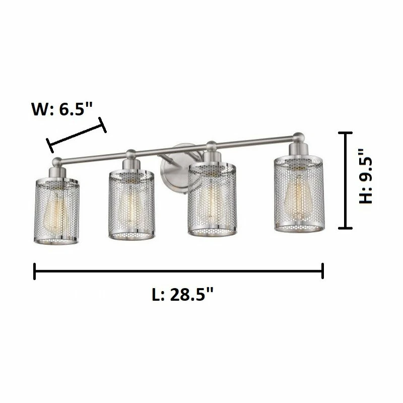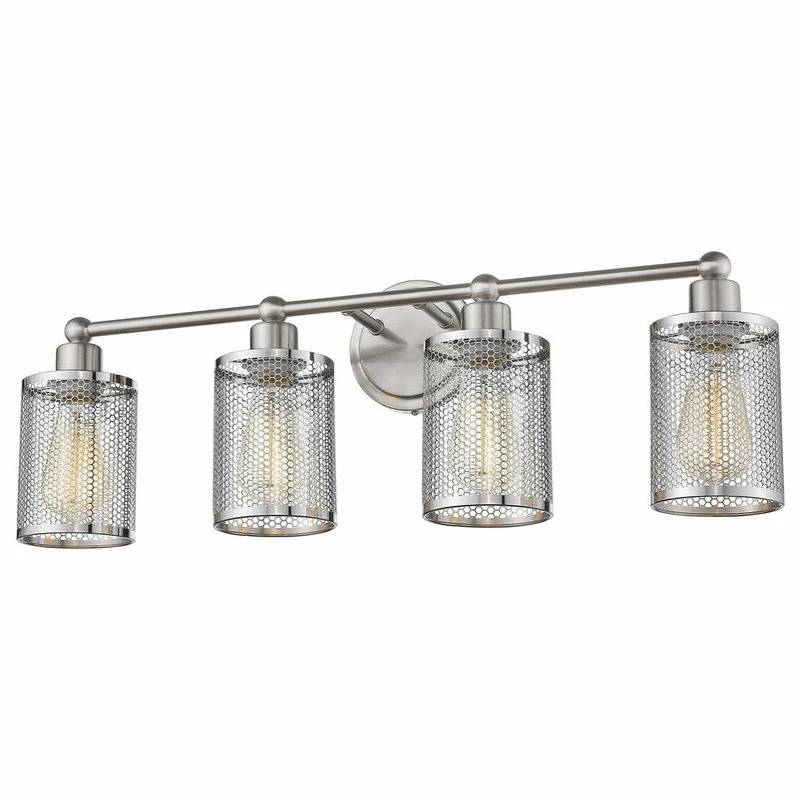 Eglo’s Verona series create edgy styling with use of unique, hexagonal mesh materials in the metal framework of their shade. This wall mounted fixture utilizes its 4 light design for an industrial yet classy feature in the bathroom at the vanity. Its brushed nickel finish with matching drum-shaped shades ensures a piece that will get noticed and make your area shine.The Verona 4 light bath bar offers metal cage shades in a brushed nickel finish with exposed downlight bulbs for a textural flair that will complement a wide variety of d��?cors