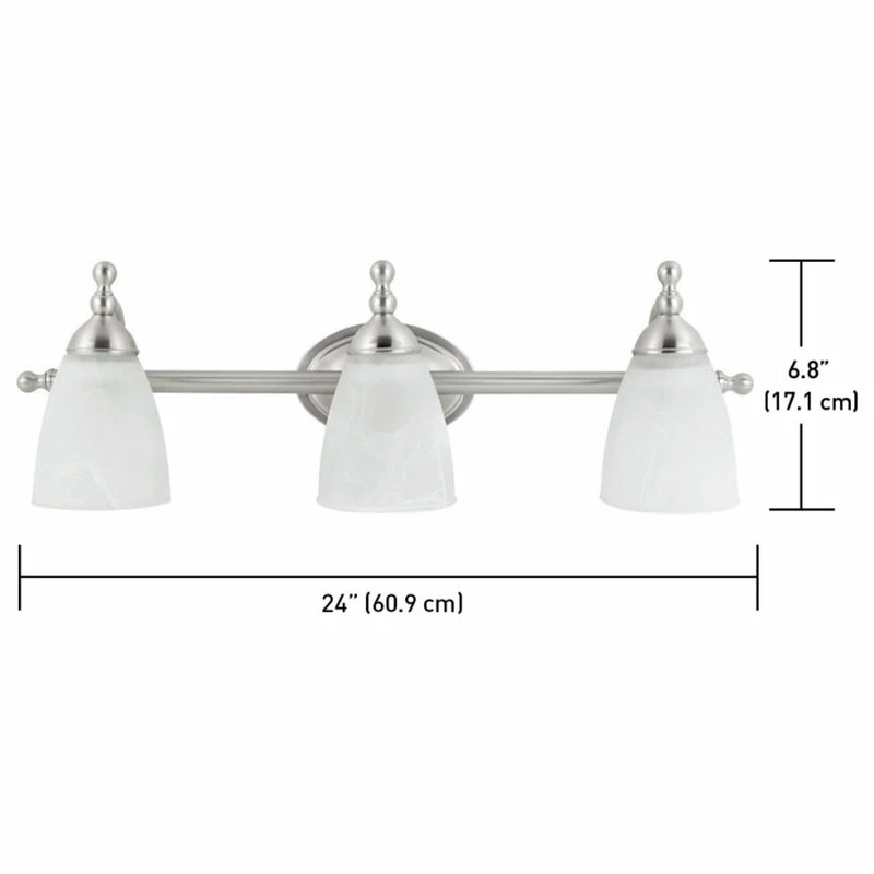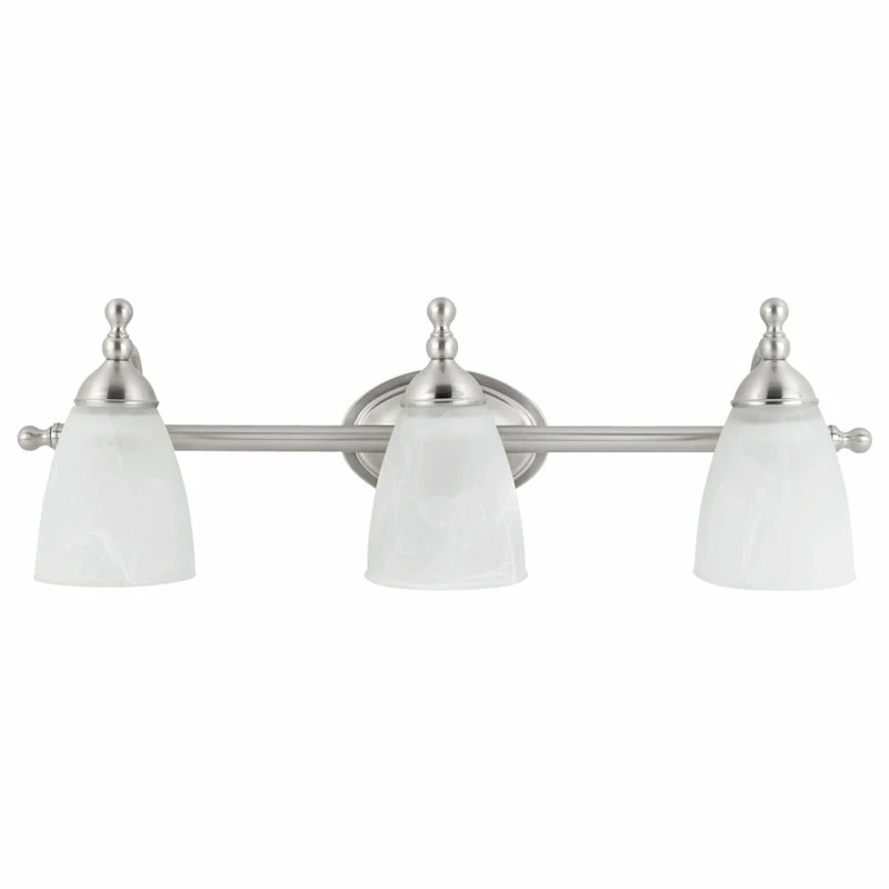 A classic 3-light vanity is the perfect piece to add to any decor and Globe Electric does it right. With simple lines and a satin nickel finish Globe Electric’s Diana 3-Light Exclusive Vanity can go anywhere you need extra light. The alabaster glass shades diffuse the light just perfectly so you have a wonderful spread of light without it being pointed. Update your bathroom and bring it into the modern style with this fixture or add it to your bedroom to create a nice little makeup nook. Add a dimmer switch and compatible bulbs to create the perfect ambiance. Requires three medium based A19 60W bulbs (sold separately)