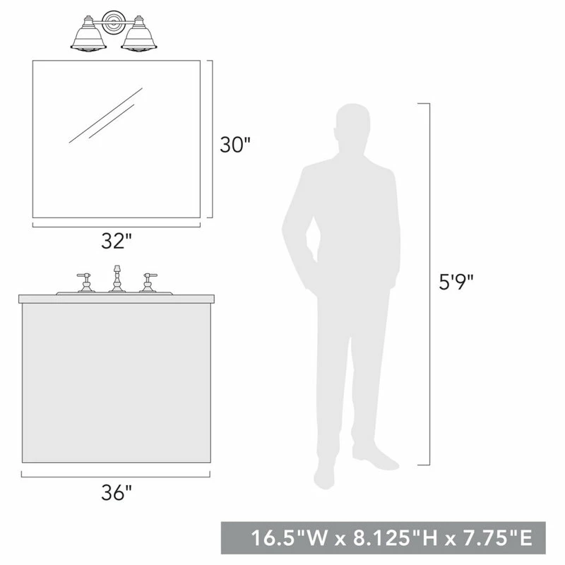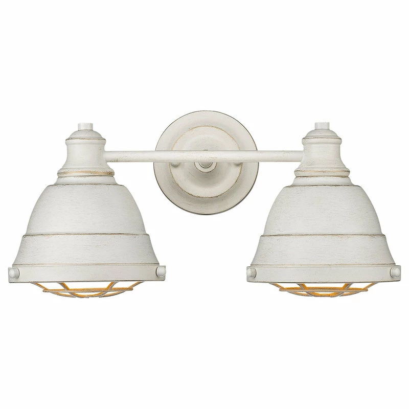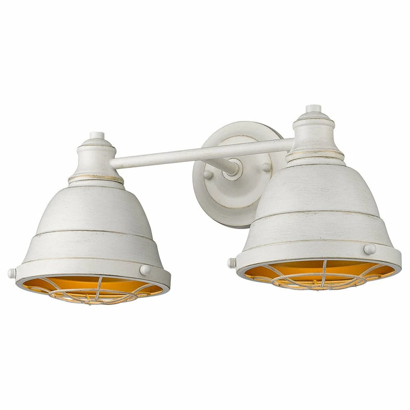 Golden Lighting’s Bartlett collection features industrial, vintage-inspired fixtures with simple, traditional silhouettes that are a nod to a bygone era. The collection features authentic details like caged diffusers and exposed hardware. The French White finish features brushed gold highlights. This 2 Light bath vanity is UL approved damp locations.