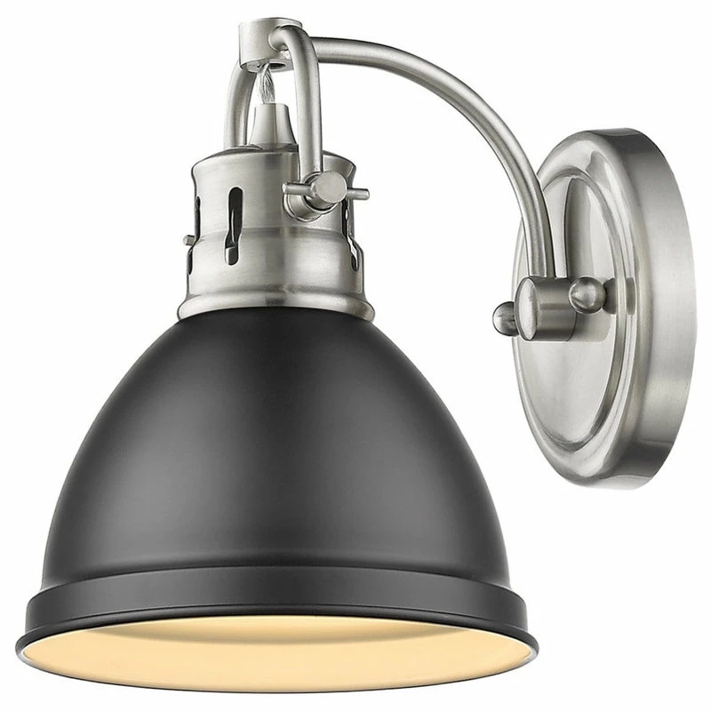 Transform the look of your room with this classic, vintage-inspired fixture by Golden Lighting. Golden Lighting’s Duncan collection is contemporary style with an industrial feel. The collection features a variety of simple, traditional silhouettes that are a nod to a bygone era. A variety of plated and painted metal shade finishes are offered in combination with durable Aged Brass, Black, Chrome or Pewter fixture bodies. The Rubbed Bronze fixtures are paired with Rubbed Bronze shades. This 1-light bath vanity is perfect for modern or contemporary style home decors. It is UL approved for damp locations and works well in a bathroom, living room or hallway. This soft pewter 1-light bath vanity is paired with a matte black shade. The shade is a soft, matte black.