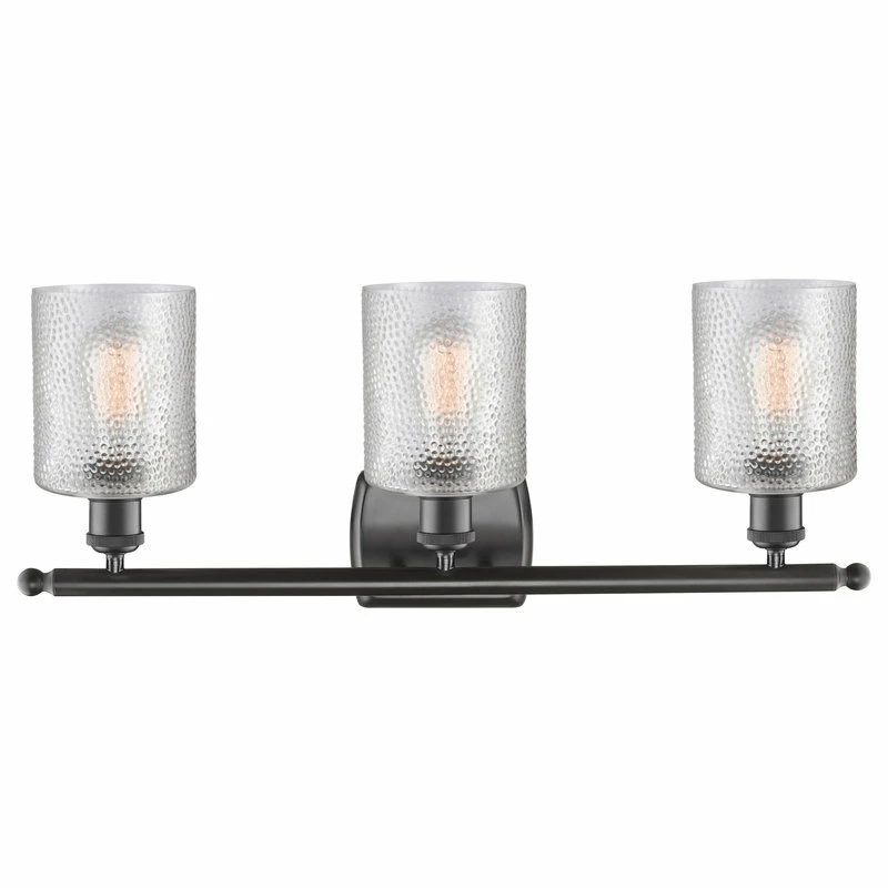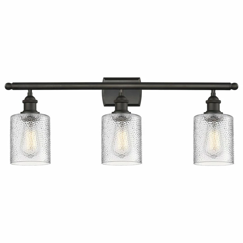 - Cobbleskill 3-100 watt 26 inch Oil Rubbed Bronze Bathroom Fixture with Clear Ripple glass