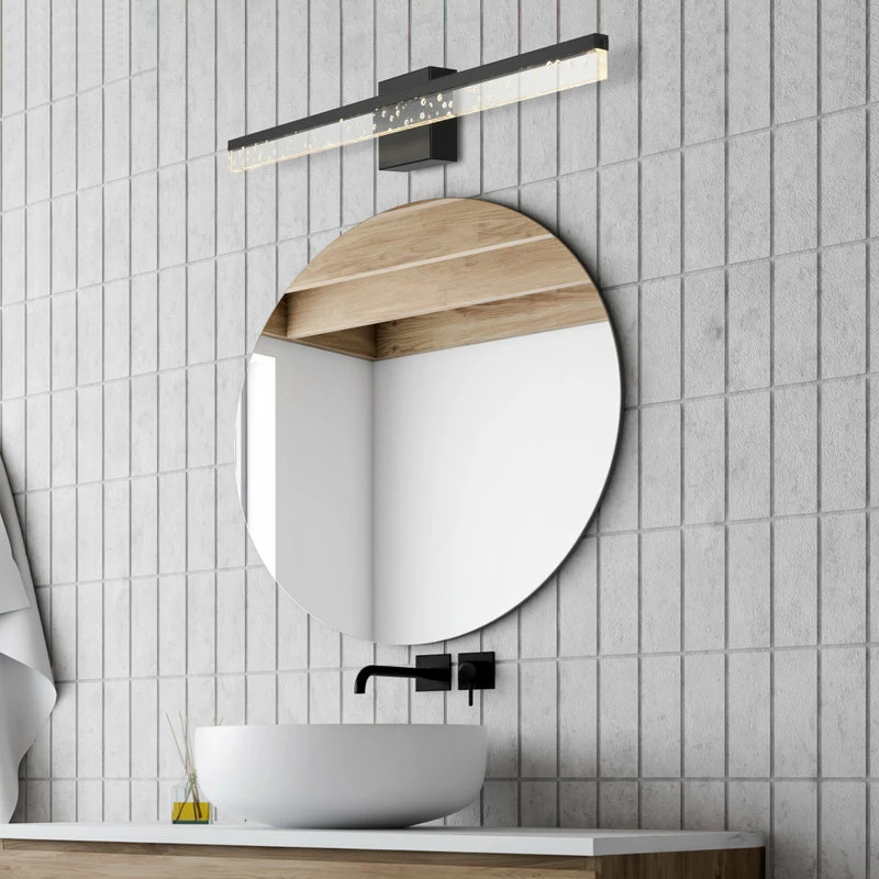 A contemporary wall light for the bath vanity or kitchen, this modern LED sconce can be rotated to change the angle. Our minimalist design has a sleek bar of seeded acrylic, plus energy-saving, integrated LEDs that last up to 15 years. Providing plenty of bright, clear light, this flush-mounted light fixture is versatile enough for any modern space.