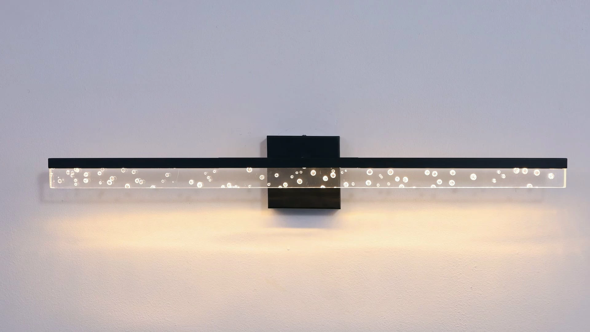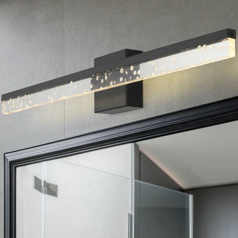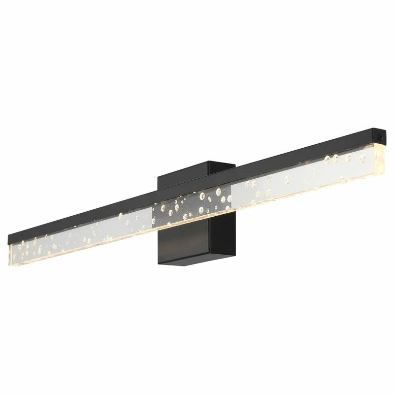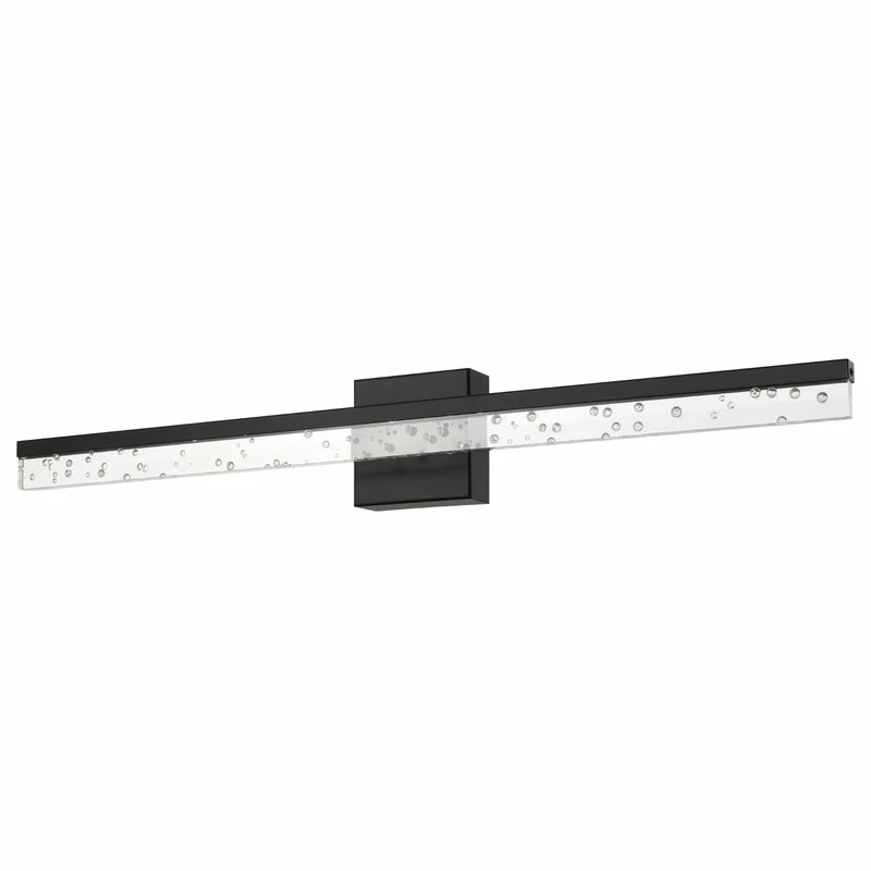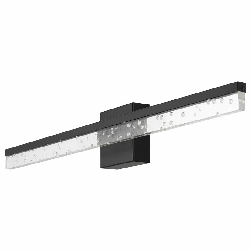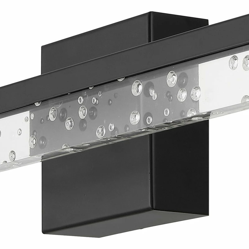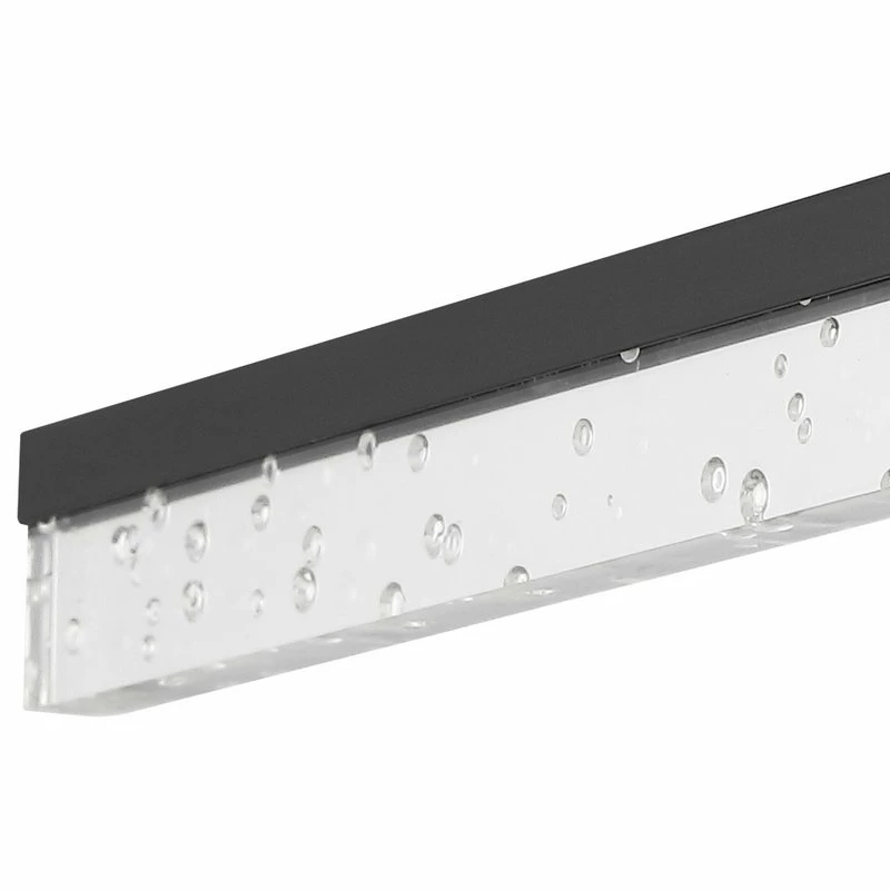 - This light’s linear design features clear acrylic with a seeded glass look, and a black metal finish