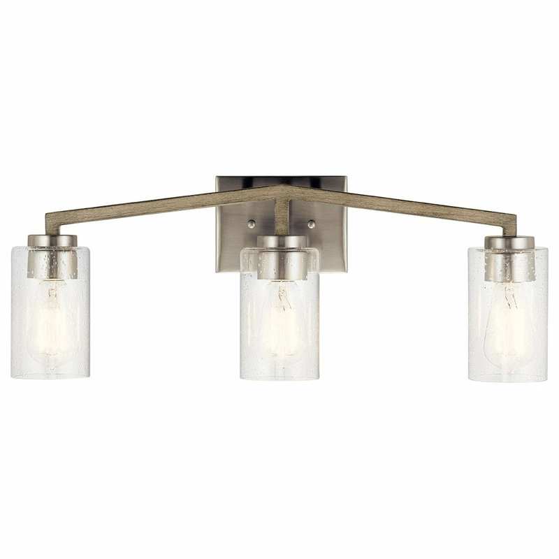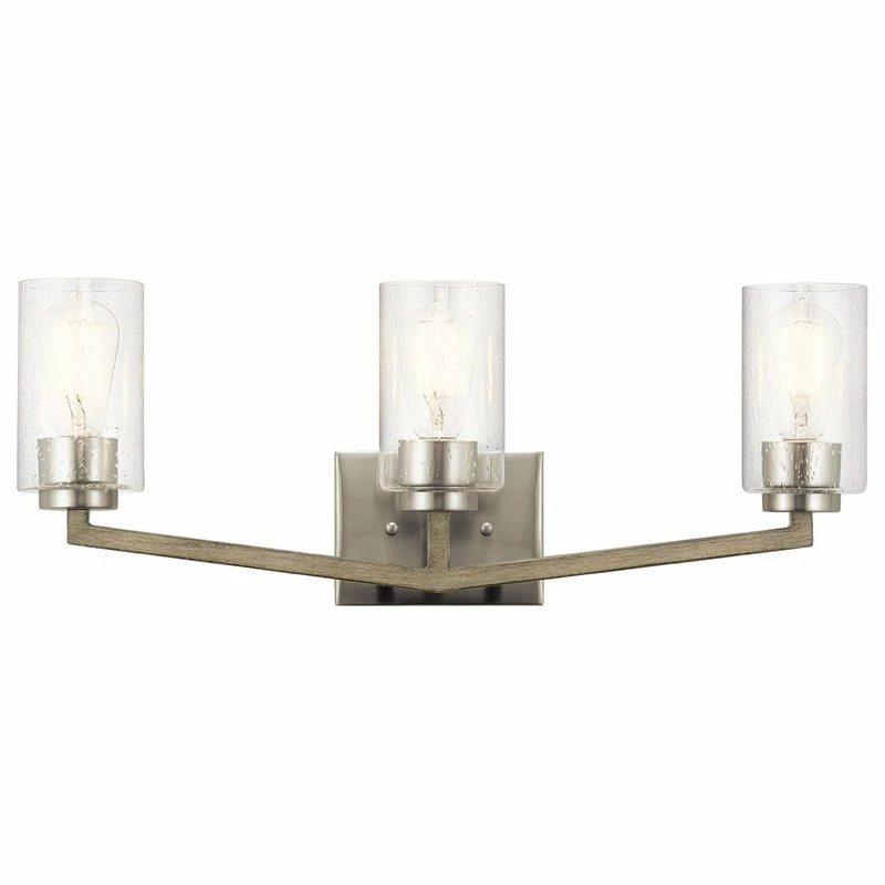 The 3-light wall mount from the DerynTM bath collection delivers a minimalist style with crisp, clean lines and angled structure. Accented with Clear Seeded Glass and a Distressed Antique Grey finish, the fixture makes an excellent addition to refined rustic and coastal bath settings