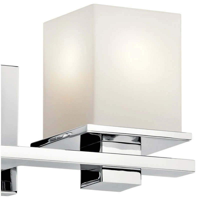This 2 light bath light from the Tully(TM) collection creates a pleasing flow in any bathroom or vanity space. Characterized by clean lines and a simple cubic design, it provides an airy, uncluttered feel with an understated, contemporary flair. Featuring a Chrome finish with Satin-Etched Cased Opal Glass, this composition blends effortlessly with existing decor while still leaving a unique impression. May be installed with glass up or down.