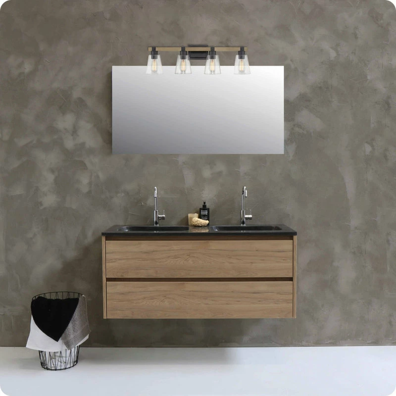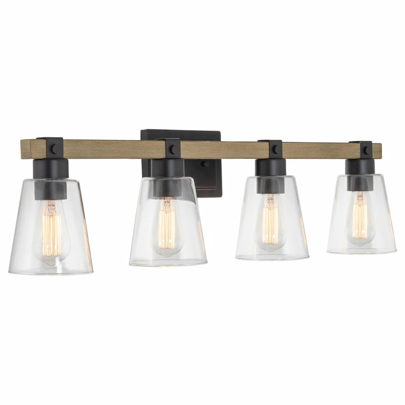 Kira Home’s Asher 32″ 4-light vanity light brings an attractive industrial farmhouse feel to your home. Featuring a stunning metal wood style in smoked birch and black finish and durable glass funnel shades, this wall fixture conveys both quality and character. Asher is constructed with quality materials and has been designed with attention to detail and suits styles such as rustic and country decor well. ETL listed for damp locations, mount above the bathroom mirror or vanity in your powder room with the shades pointed in either an up or down direction. Illuminate covered outdoor spaces like porches and patios. Need to set the mood? Asher works with standard dimmer switches when used with compatible bulbs and if you’re looking for a vintage look and feel, choose bulbs with an Edison style. Unlike our low priced competitors, Asher is ETL approved for your safety.
