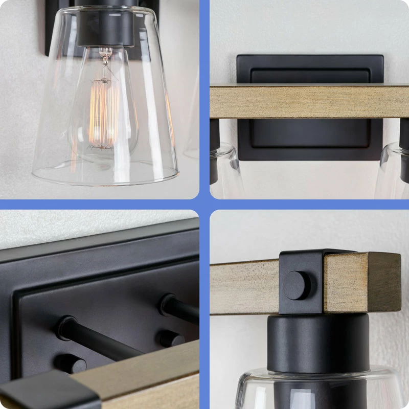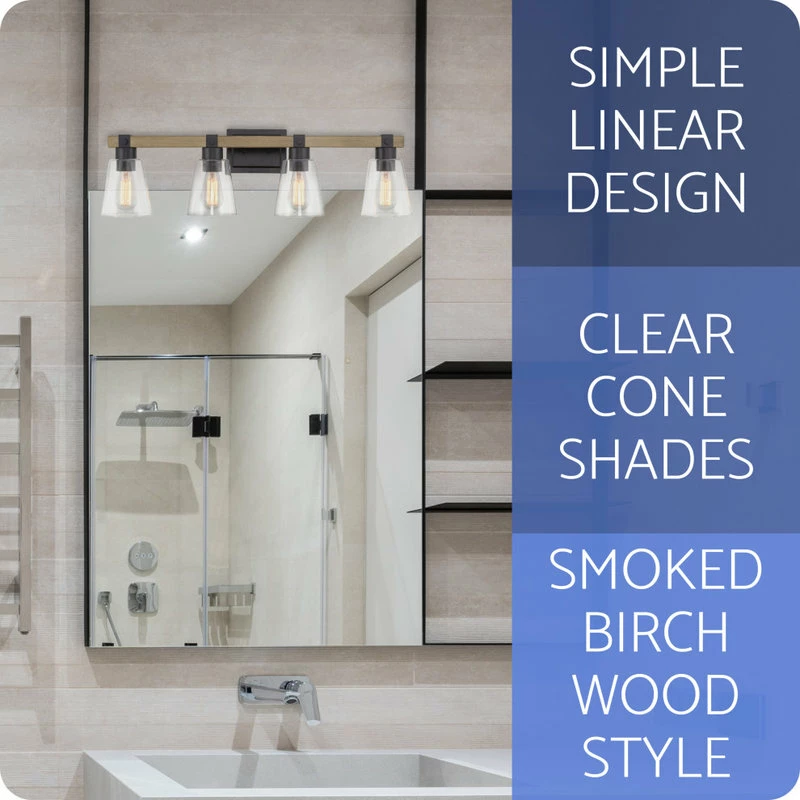 MODERN FARMHOUSE DESIGN: Metal wall vanity light showcases a black finish with complementing clear conic glass shades, fitting styles such as rustic & industrial. Smoked birch wood style linear bar adds extra wow factor & allows for up/down installation