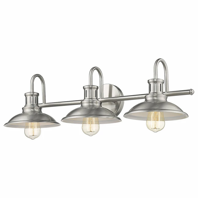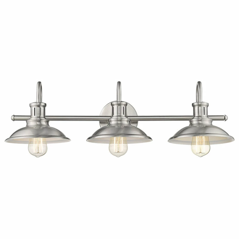 With its chic look and classic satin Nickel finish, this three-light down fixture is a great choice for a variety of aesthetics. With a mix of modern and restoration design and finished in our traditional brushed nickel finish, this over-the-mirror, three-light vanity lighting fixture works perfectly for your remodeled bathroom. This lighting fixture uses 3 – 100 watts Medium based bulbs (sold separately) and is LED compatible.
