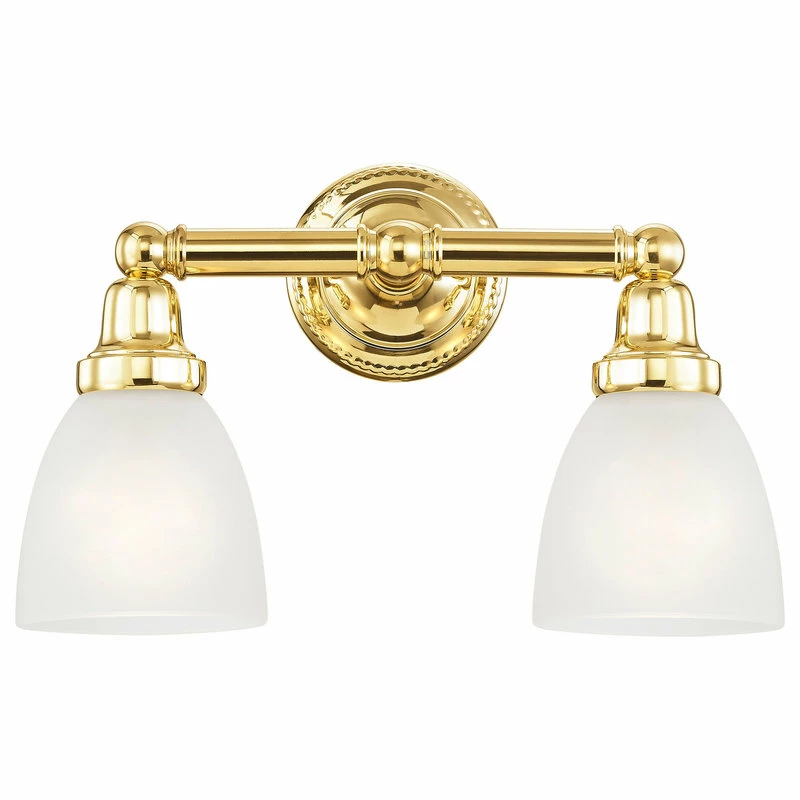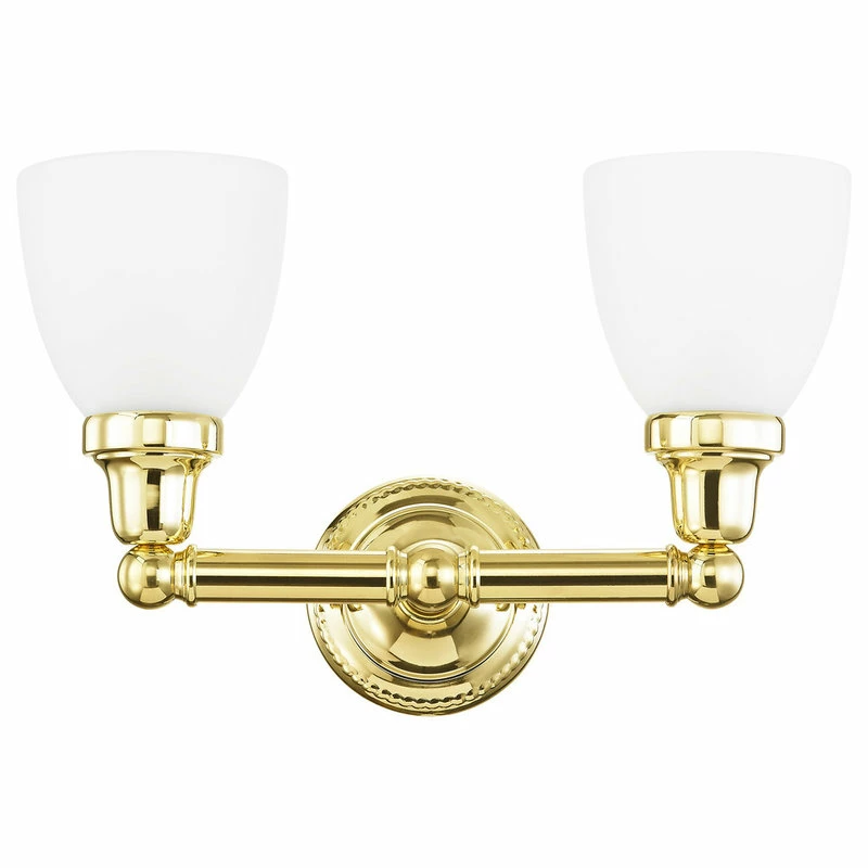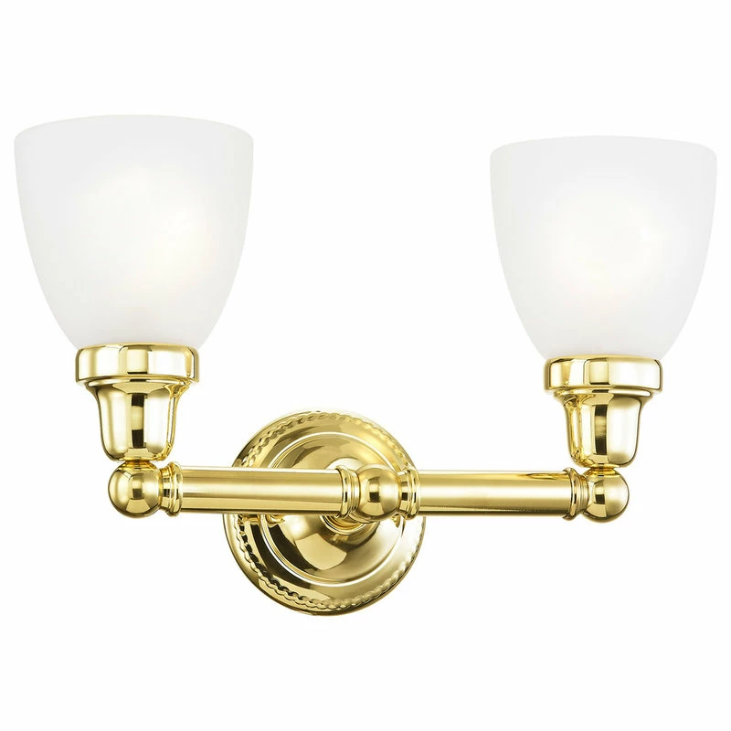 In a polished brass finish, this one light bath fixture features a timeless torchiere design. Topped with Satin Opal White glass shades which provide a clean and classic look that will complete any space. This fixture is the perfect finishing touch to your bathroom!