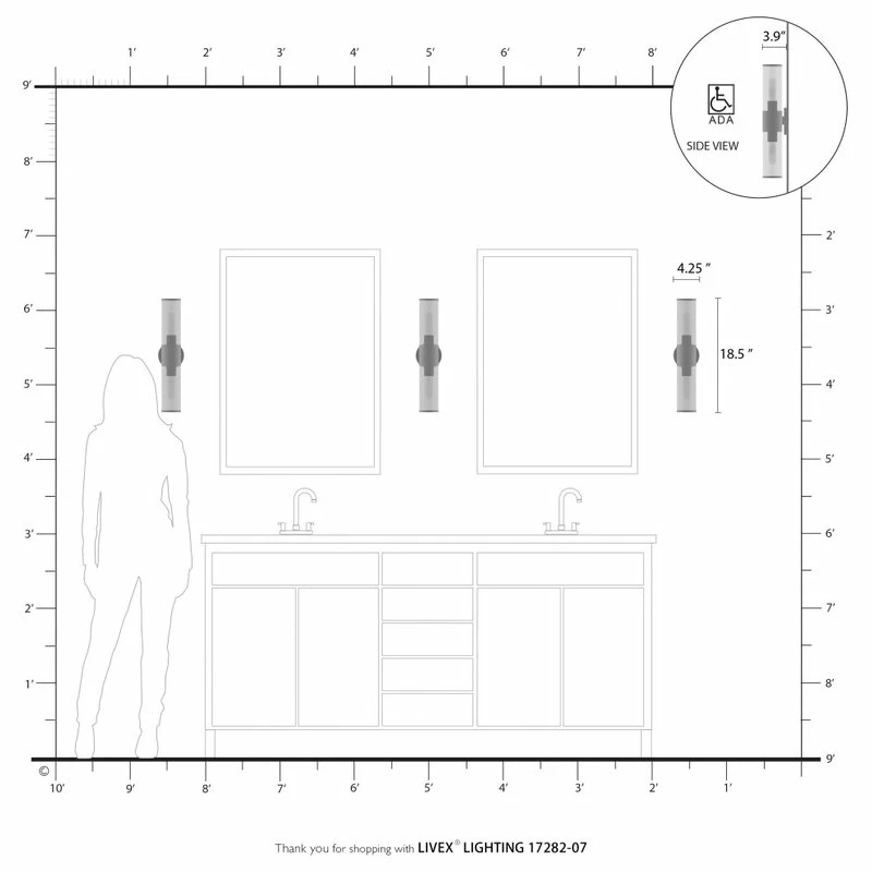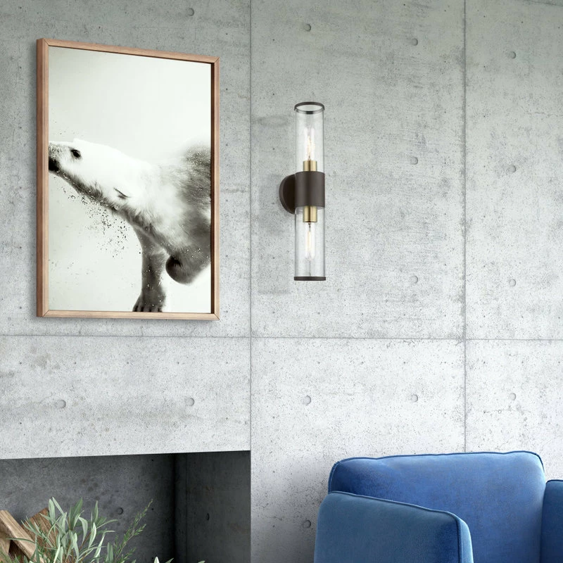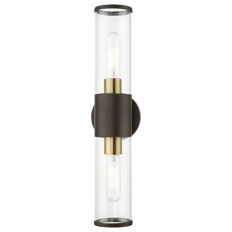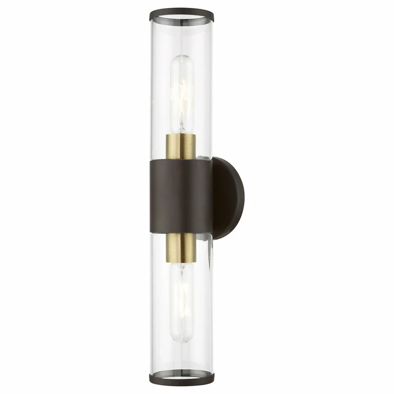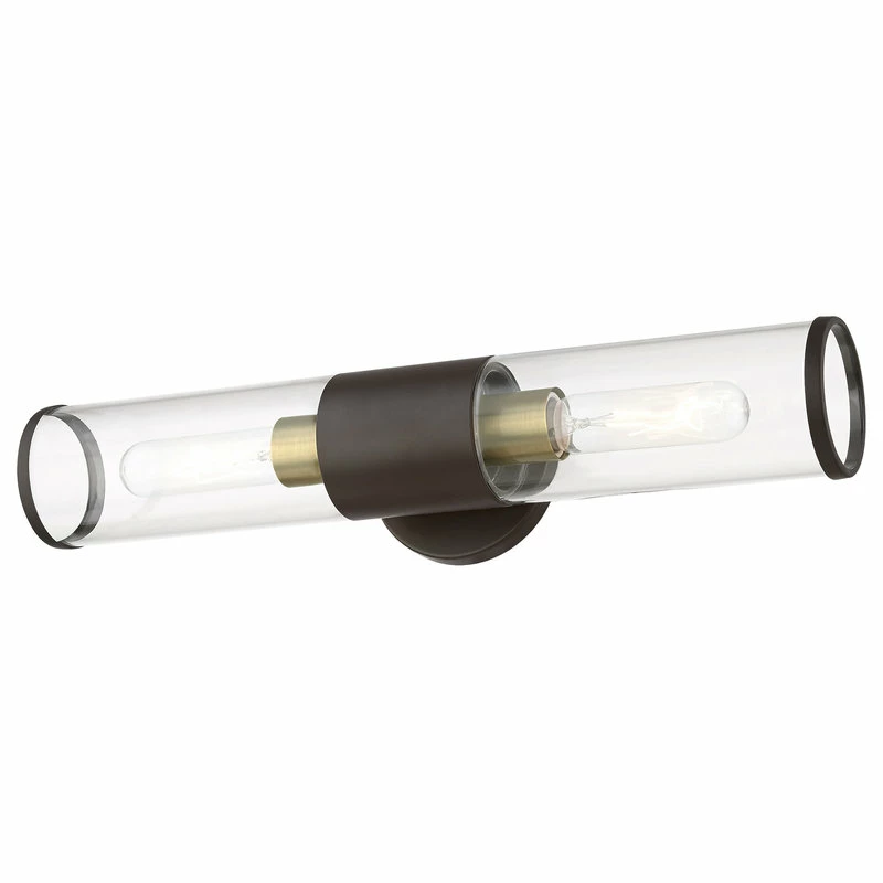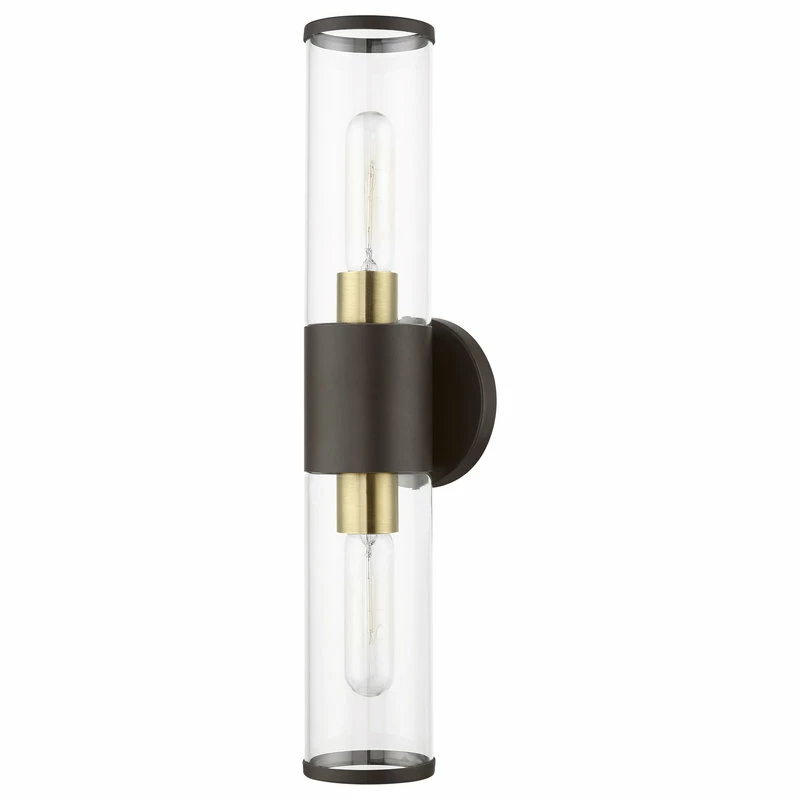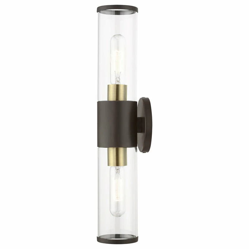 Add a dash of character and radiance to your home with this wall sconce. This double-light fixture from the Banca Collection features a bronze finish with clear hand blown glass intentionally exposing the bulb inside for a trendy look. The clean lines of the back plate complement the cylindrical glass shade adorned with detailed trim on top creating an industrial, sleek, urban look that works well in most of today�s interiors. This fixture adds upscale charm and contemporary aesthetics to your home.