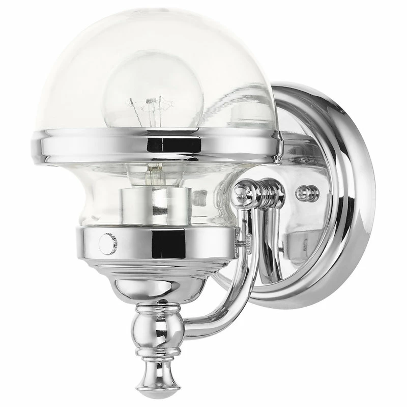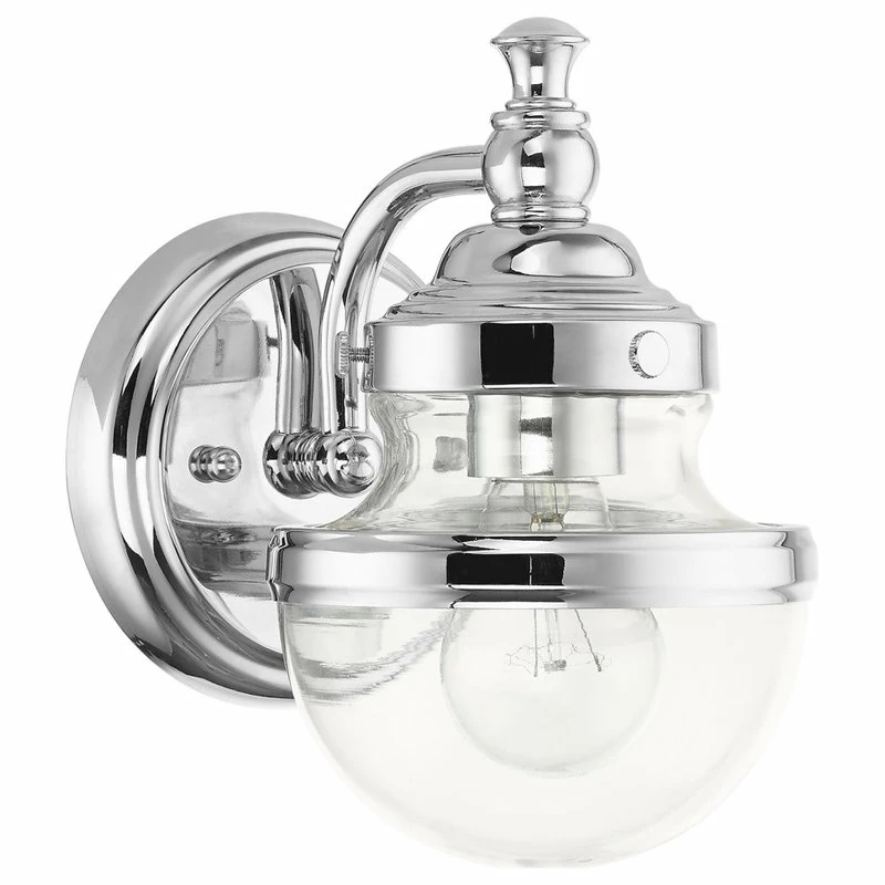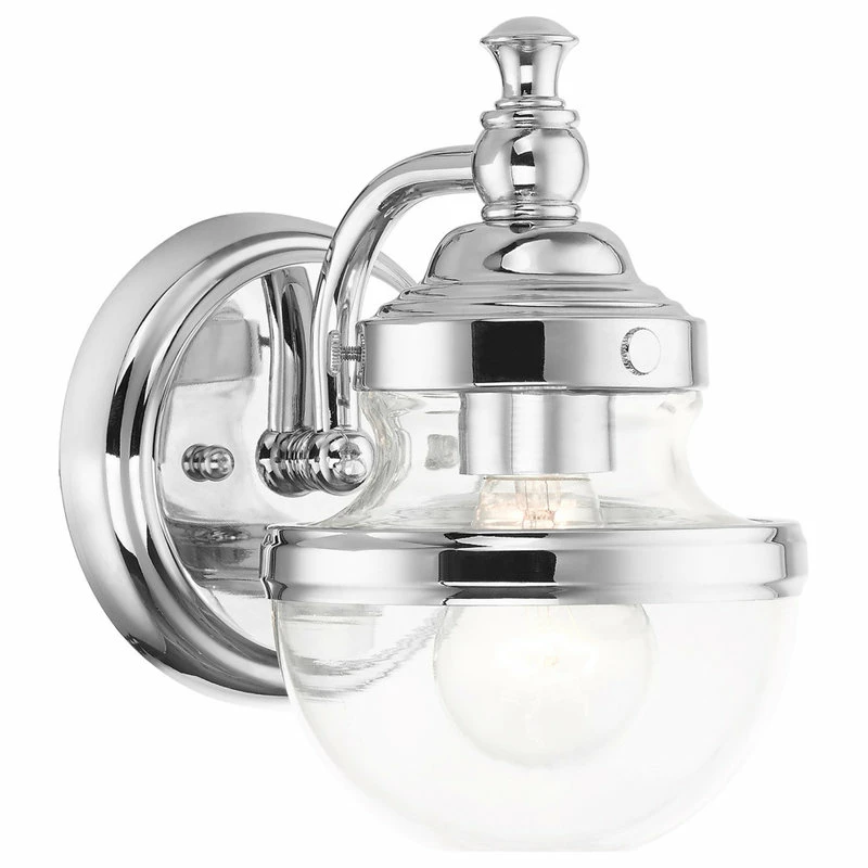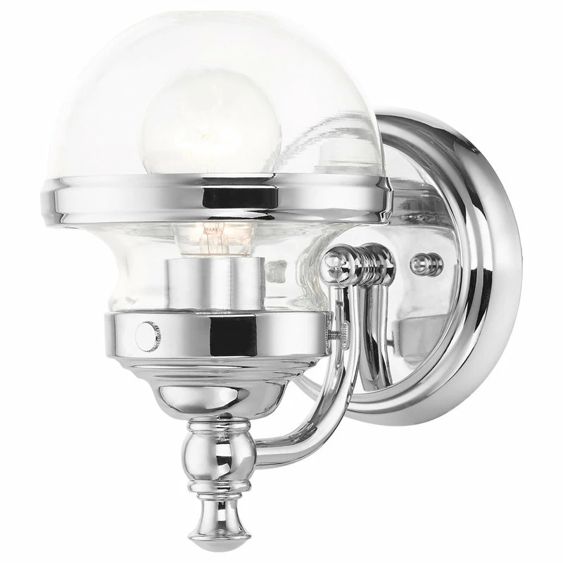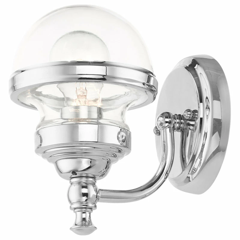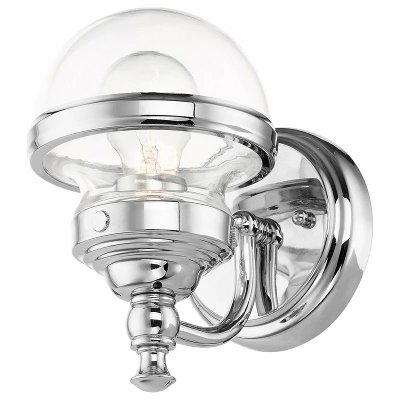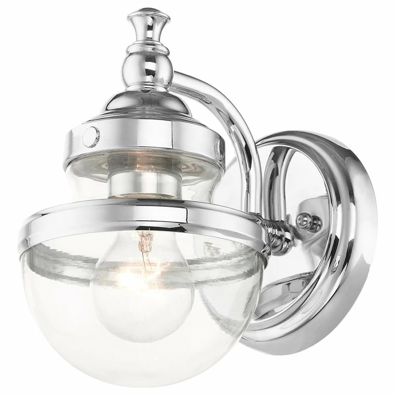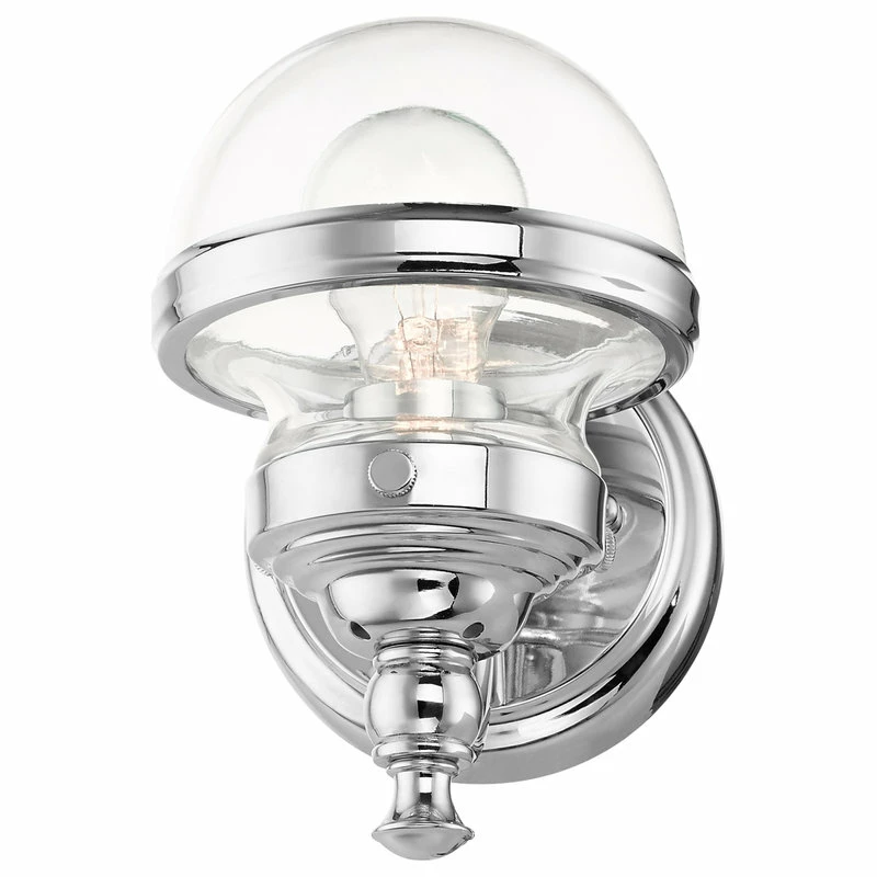 Sleek and simple lines define this beautiful polished chrome finish single light sconce from the Oldwick collection. The clean, bold look of modernity blends with a raw industrial inspiration and hand blown clear glass give this design a versatile and eclectic look that works with nearly any style of home decor.