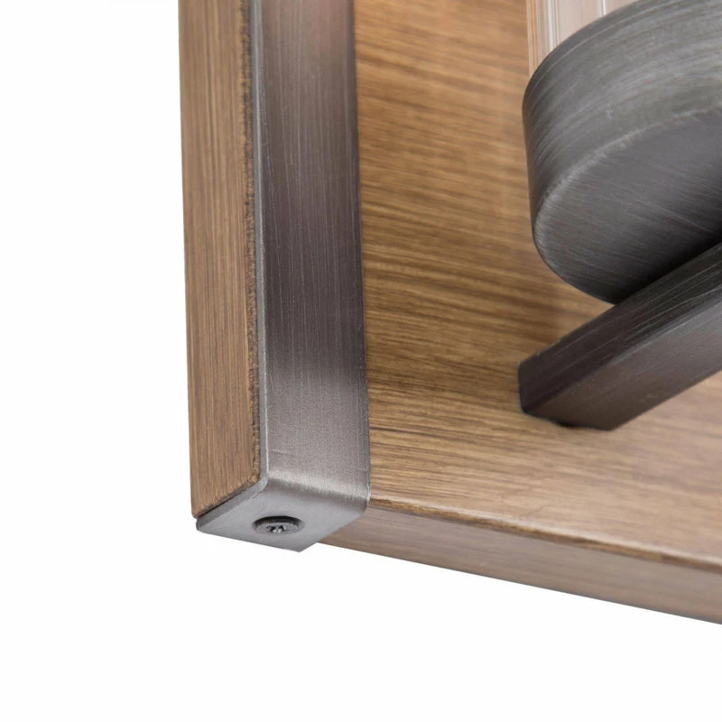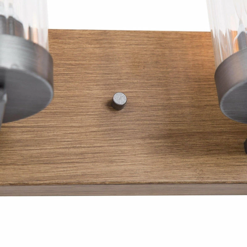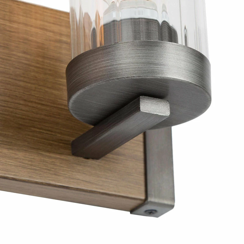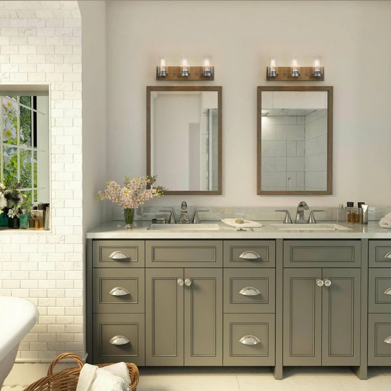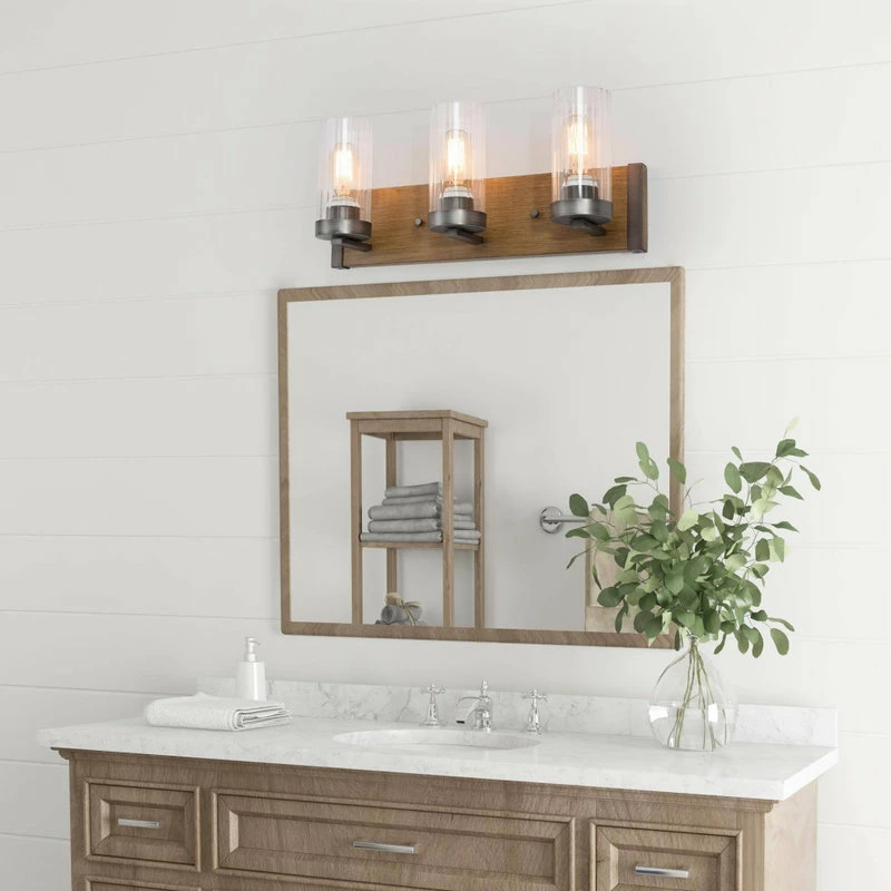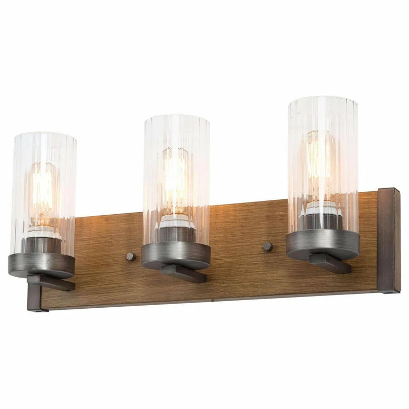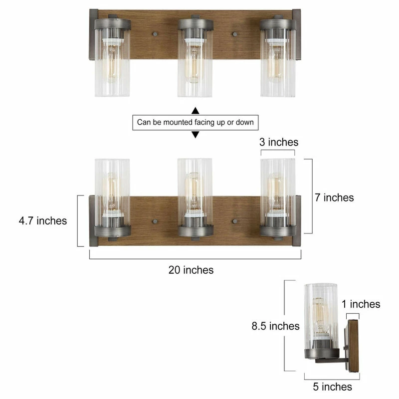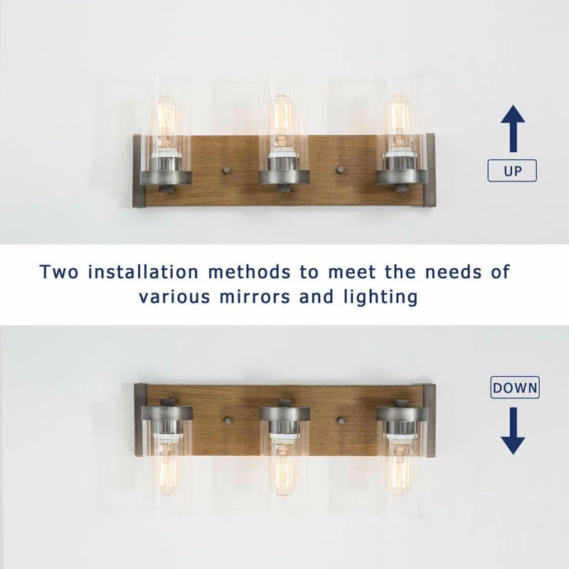 This 3-light vanity light fixture is a wonderful blend of rustic and industrial tastes. The faux wood finish accents stand out against the antique silver finish of the backing and decorative pieces. Three clear glass shades give a creative touch to this accent piece.This vanity fixture includes all necessary mounting hardware for guaranteed quick and easy installation. And you can installed it up or down.