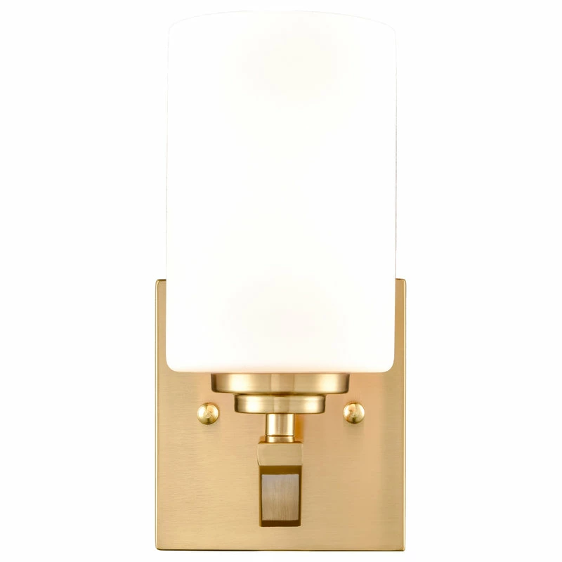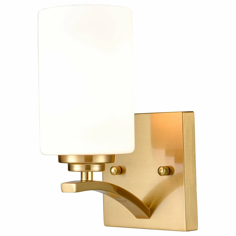 Flaunting natural brass finish, the wall sconces bring a pop of industrial style to your living space. Crafted from milk frosted glass, the cylinder shades of the wall sconces bring a stylish flair to your home interior. Being fitted with curved arms and cylinder shades, they add a refined touch and bold geometric accent to your aesthetic.