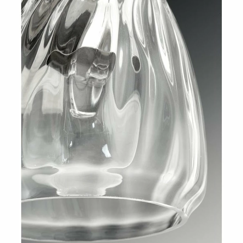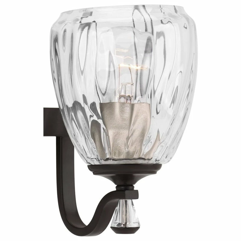 A distinctive collection with casual crystal details. Each fixture in the Anjoux family features variations of complementary designs. Sconces are highlighted by clear water glass shades, while chandeliers are adorned by elegant crystal finials. A flush mount version emulates cascading embers with teardrop crystal accents.