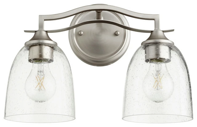 QUORUM INTERNATIONAL 5027-2-265 Jardin 2-Light Vanity Light, Satin Nickel w/ Clear/SeededSeries: JardinFinish: Satin Nickel w/ Clear/SeededDimension(in): 9.75(H) x 14.5(W) x 5.75(Ext)Bulb: (2)100W Medium Base(Not Included)Diffuser Material: GlassShade Color: Clear seededUL Type: Damp