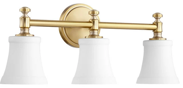This 3 light Vanity from the Rossington collection by Quorum will enhance your home with a perfect mix of form and function. The features include a Aged Brass finish applied by experts.