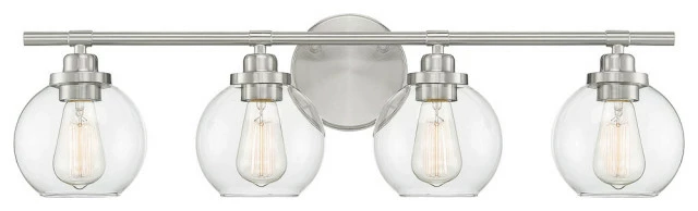 Adding the Savoy House Carson 4-light bath bar easily helps you boost the illumination and the style of any bathroom. Its fishbowl-style clear glass shadesmake a big statement and are open at the bottom making it easy to replace the bulbs. The streamlined structure offers up subtle detailing with a mid-century modern vibe and the circular backplate echoes the shape of the glass shades. Finished in satin nickel. This fixture is 30″ wide and 8.5″ tall. It extends 7″ from the wall. Uses 4 standard size bulbs of up to 60 watts each (not included).