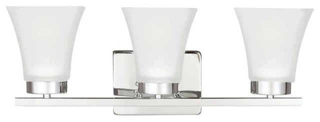 The Sea Gull Lighting Bayfield three light wall sconce in chrome offers shadow-free lighting in your powder room, spa, or master bath room. The Bayfield bath collection by Sea Gull Lighting delivers simplicity with flair. The transitional design is a subtle combination of clean lines and flared, angular Satin Etched glass shades to bring style and warmth to the bathroom no matter the budget. Both incandescent lamping and energy star-qualified fluorescent lamping are available.